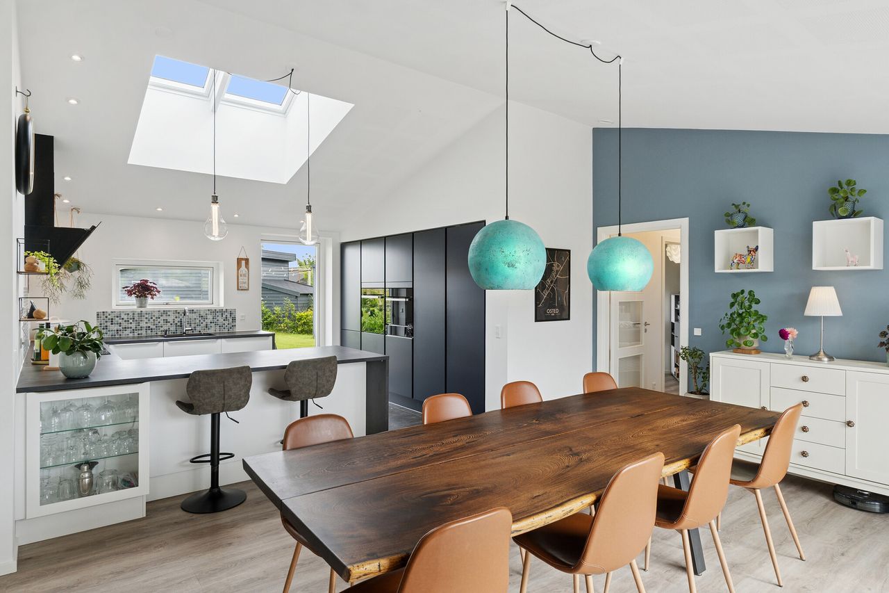 Køkken/alrummet er husets naturlige samlingspunkt – her er der loft til kip, ovenlys og akustiklofter, som sikrer et behageligt indeklima og en luftig atmosfære. Bag den stilrene midnatsblå skabsvæg gemmer sig et praktisk og diskret viktualierum – perfekt til opbevaring.