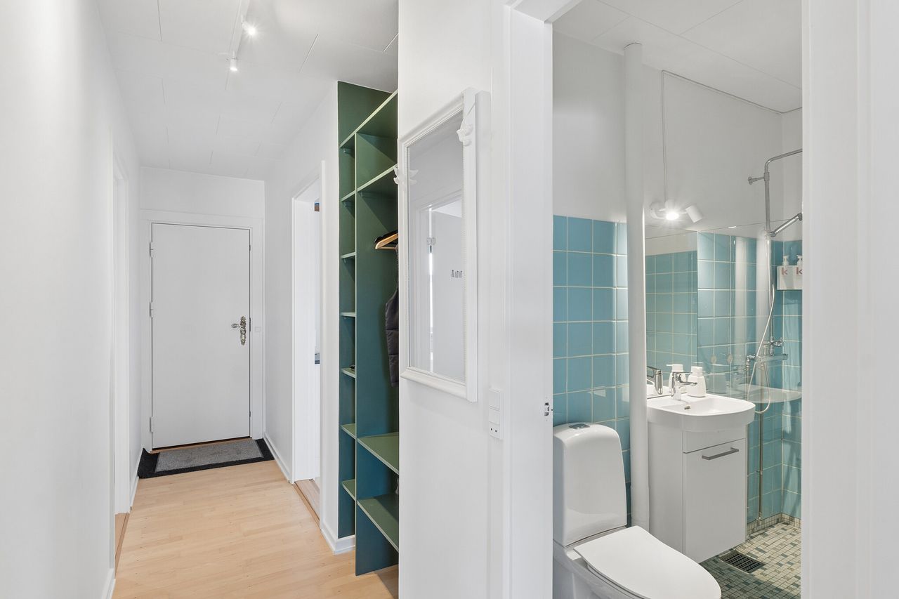 Køkkenet er et nyere, stilrent HTH-køkken med gode arbejdsforhold og hvidevarer – herunder Miele vaskemaskine. Badeværelset er udført i klassisk stil med både hoved- og håndbruser, og entréen byder på praktiske snedkerhylder og garderobeplads.