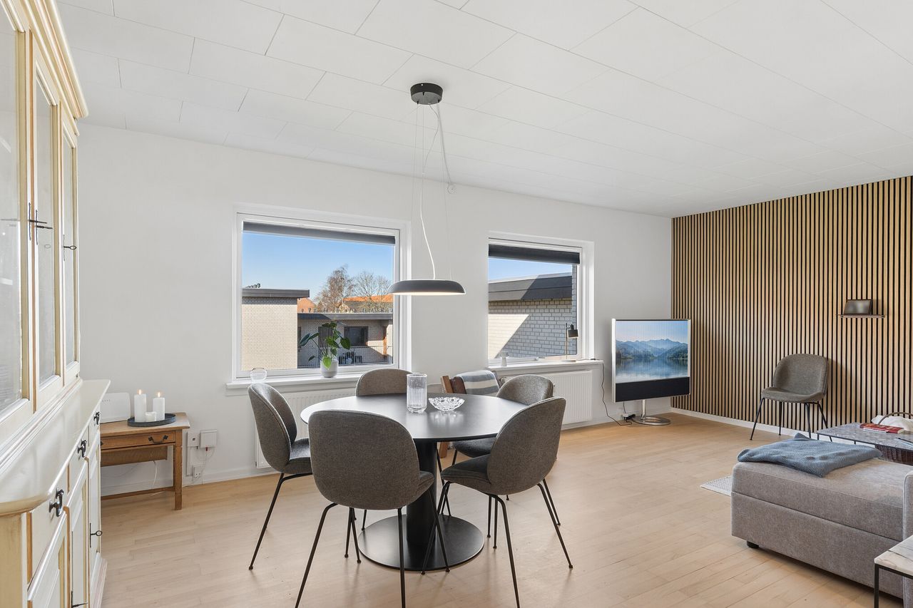 Lejligheden på 73 m² fremstår pænt og moderne istandsat i januar 2026 med hvidmalede filtvægge og akustikpaneler i egetræsfiner. Gulvene er slebet i stue, gang, køkken og soveværelse. Den rummelige opholdsstue har god plads til både spiseafdeling og sofaarrangement, og soveværelset rummer nemt en dobbeltseng på op til 180 cm samt god skabsplads.