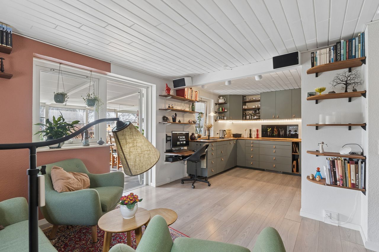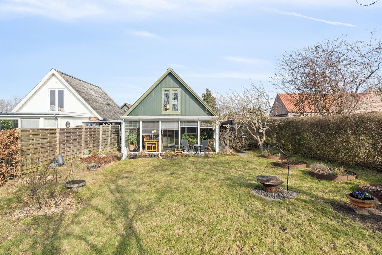 Boligen rummer 83 boligkvadratmeter. I stueplanet, hvor der er gulvvarme, finder I et nyere køkken i åben forbindelse med stuen. De gode opholdsrum giver plads til både afslapning og samvær, og fra stuen er der adgang til en opvarmet lys udestue med store glaspartier. Her får I et unikt opholdsrum, hvor I kan nyde årstidernes skiften på tætteste hold året rundt, som at sidde ude i haven. Planløsningen byder desuden på et værelse og badeværelse i stueplan, mens førstesalen rummer endnu et værelse samt et alrum, som kan indrettes efter behov – f.eks. som kontor, opholdsrum eller ekstra soveplads.