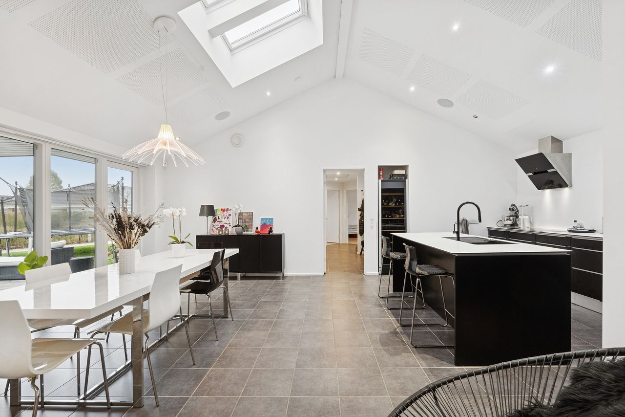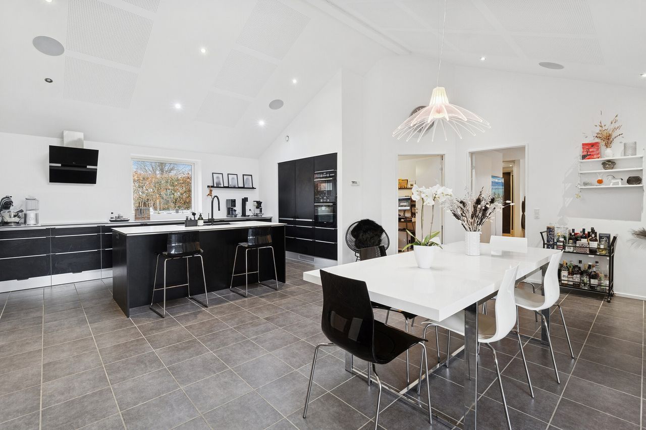 Boligen byder jer velkommen i en indbydende entré hvor vaskefaciliteter, opbevaring og husets teknik er samlet ét sted. Herfra åbner hjemmet sig op mod det imponerende køkken-alrum, som uden tvivl er boligens naturlige samlingspunkt. Loftet er ført til kip og kombineret med integrerede akustiklofter, der skaber en behagelig rumklang og understreger den eksklusive atmosfære. Køkkenet er stilrent og gennemtænkt ned til mindste detalje med to integrerede ovne, vinkøleskab og store arbejdsflader – perfekt til både hverdagsliv og gæstebesøg. De markante vinduespartier mod syd samt dobbelte ovenlysvinduer sikrer et enestående lysindfald dagen igennem.