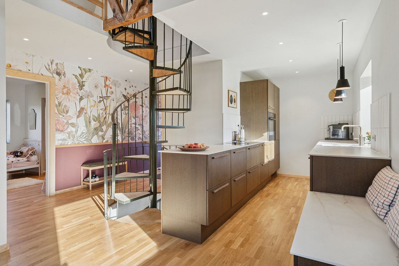 Brændeovnen i stuen giver hygge på kølige aftener, mens spindeltrappen binder etagerne elegant sammen. I kælderen, som også har egen indgang, finder I tre gode disponible rum, endnu et moderniseret badeværelse med gulvvarme, dette fra 2020, samt et vaskerum.